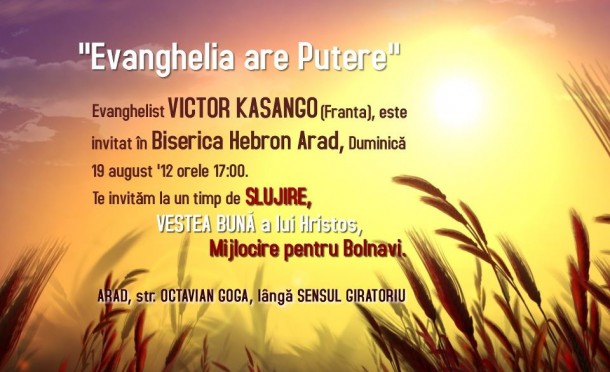 Duminică, 19 august 2012, Biserica “Hebron” din Arad are deosebita plăcere de a vă invita la un eveniment evanghelistic ce se va desfăşura în locaşul de cult începând cu ora 17:00.