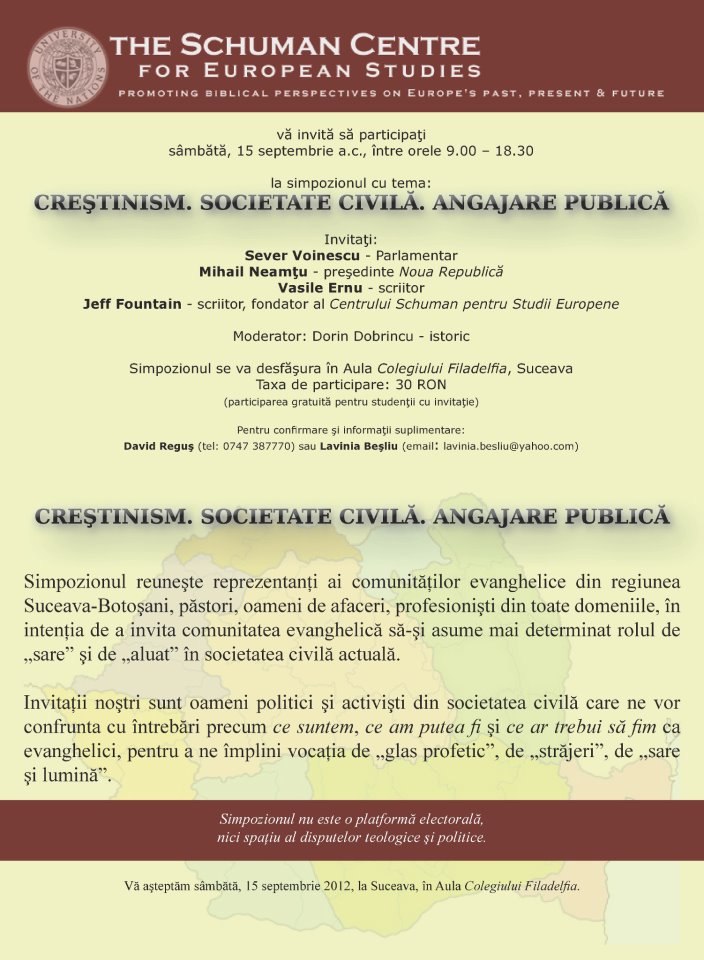 Centrul Schuman pentru Studii Europene vă invită să participaţi sâmbătă, 15 septembrie, între orele 9:00 – 18:30, la simpozionul cu tema: “Creştinism. Societate Civilă. Angajare Publică”.