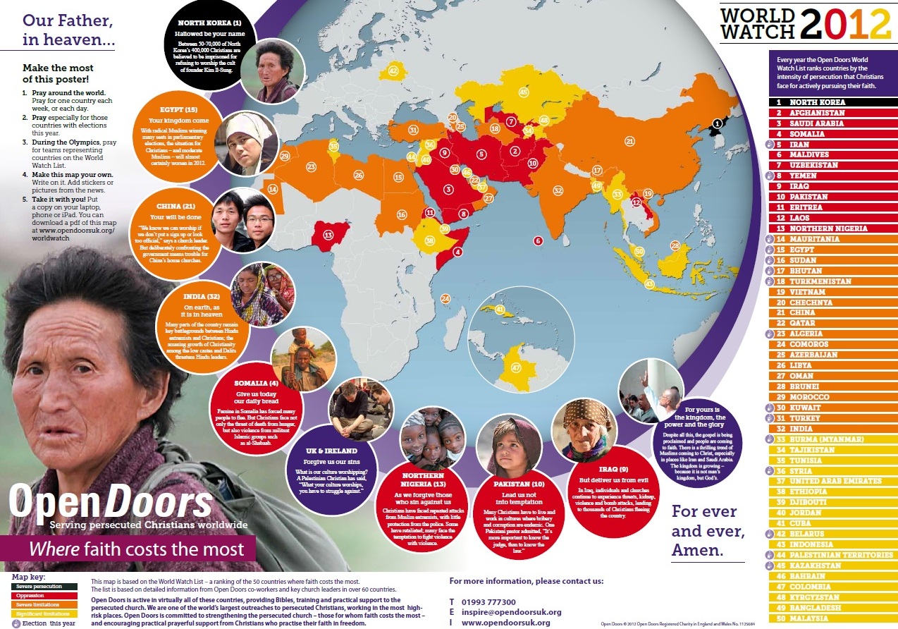 Există locuri în lume, cum ar fi Coreea de Nord, în care actele de persecuție au loc, dar nu putem vedea sau auzi. Sunt mii de frați şi surori creştini din întreaga lume care suferă persecuție pur şi simplu doar pentru că Îl mărturisesc pe Isus Hristos ca Domn. S-a estimat că în secolul al XX-lea au fost martirizați mai mulți creştini decât în celelalte nouăsprezece secole la un loc. BISERICA PRIGONITĂ Primele cinci țări în care biserica este cu deosebire prigonită: