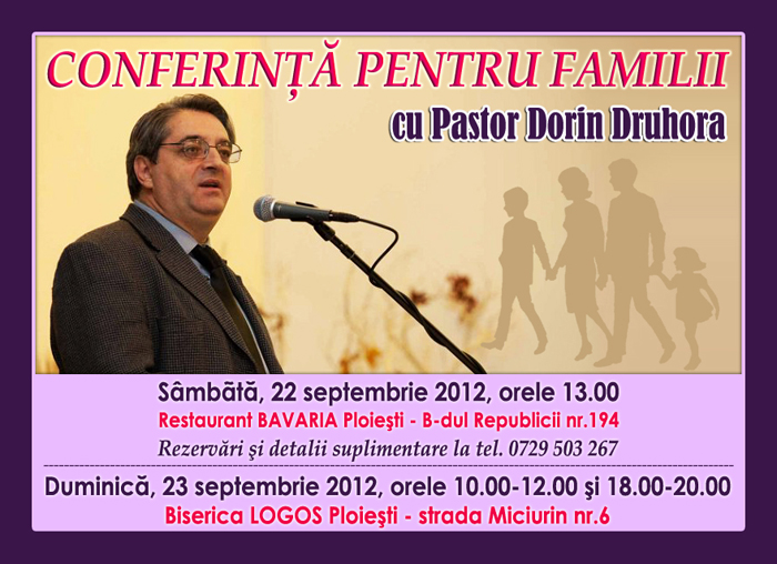 Avand in vedere cele de mai sus, Biserica “Logos” Ploiesti organizeaza o noua conferinta pentru familii, invitat special al acestui eveniment fiind pastorul Dorin Druhora din San Diego, California, un apreciat slujitor al Domnului si cu inimă si cu viziune pentru aceasta lucrare consacrata familistilor.