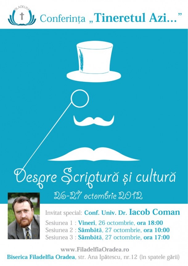 Vino, in perioada 26- 27 octombrie, la editia a II-a a Conferintei Tineretul Azi…cu tema despre Scriptura si cultura, organizată de Departamentul de Tineret al Biserici Penticostale “Filadelfia” Oradea! Vei afla care este rolul tau ca tanar in evolutia intelectuala a miscarii evanghelice din Romania. Iata cateva din tematicile abordate la cele trei sesiuni plenare: