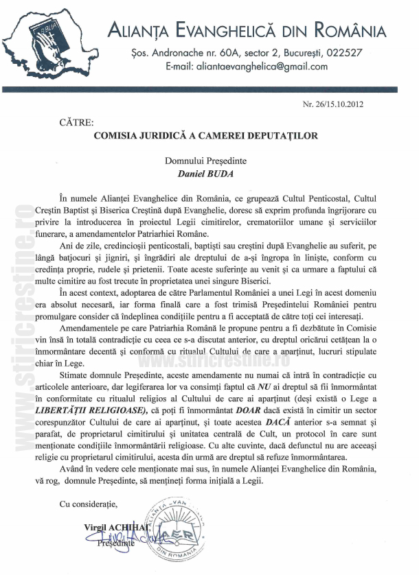 Va trimit in atasament protestul pe care Alianta Evanghelica din Romania l-a inaintat catre Comisia Juridica a Camerei Deputatilor ca urmare a amendamentelor pe care Patriarhia Romana le-a introdus in Proiectul Legii cimitirelor, crematoriilor umane si serviciilor funerare, pe care, de asemenea, le gasiti in atasament.