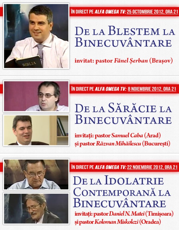 - Joi, 8 noiembrie 2012, emisiune cu tema De la saracie la binecuvantare. Invitati sunt pastorii Samuel Caba si Razvan Mihailescu.