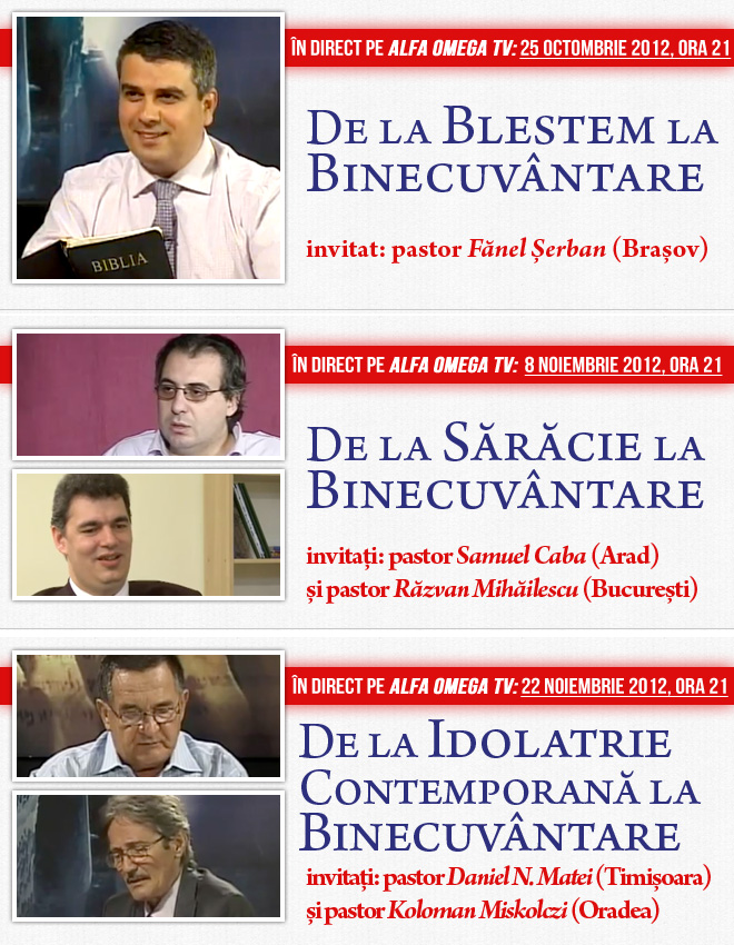 In lunile octombrie si noiembrie, Alfa Omega TV v-a pregatit o serie de emisiuni în direct, care abordeaza teme importante în vremurile în care traim. Va asteapta invitati speciali, care vor raspunde la întrebarile dumnevoastra cu privire la chestiuni precum: blesteme generationale si influenta lor în viata credinciosilor, importanta zeciuielii si administrarea finantelor dupa principiile lui Dumnezeu, solutia Bibliei pentru criza financiara din tara noastra, modul în care idolatria constituie o problema în lumea moderna.