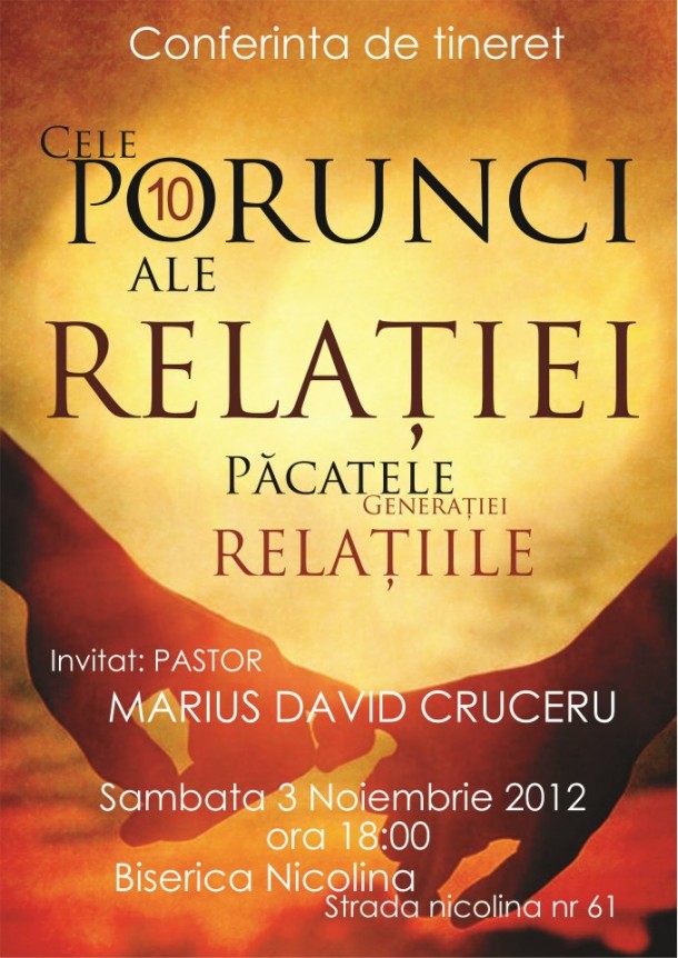 Sâmbătă, 3 noiembrie 2012, începând cu ora 18:00, vă invităm să luaţi parte împreună cu noi la o conferinţă de tineret cu tema “Cele 10 porunci ale relaţiei”.