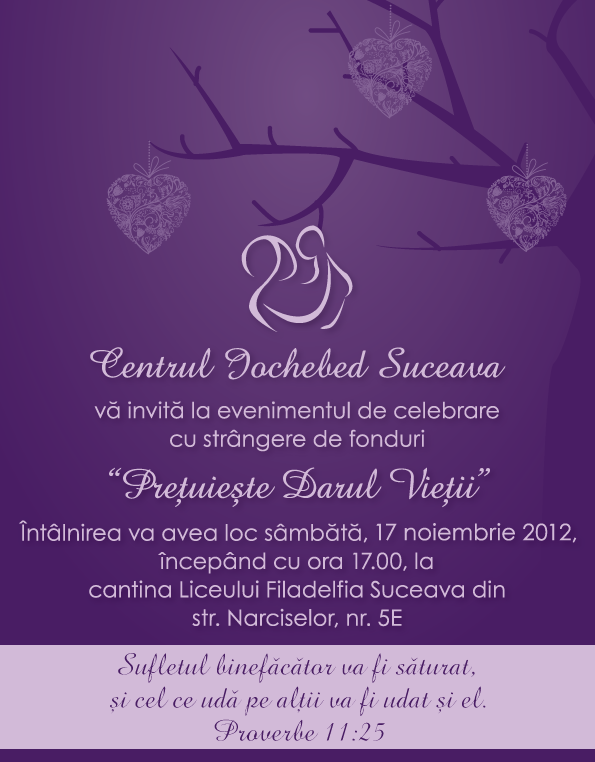 Vă invităm şi pe această cale să luaţi parte la evenimentul de celebrare a vieţii însoţit de o strângere de fonduri – ,,Preţuieşte darul vieţii”. Acest eveniment va avea loc la cantina Liceului Filafelfia, sâmbătă 17 Noiembrie 2012, la ora 17. Vă aşteptăm cu drag şi vă rugăm să ne confirmaţi fie prin email sau la telefonul 0230-523380 (Centrul Iochebed între orele 08 – 16) sau 0740660161 Gabriela Antonesi.