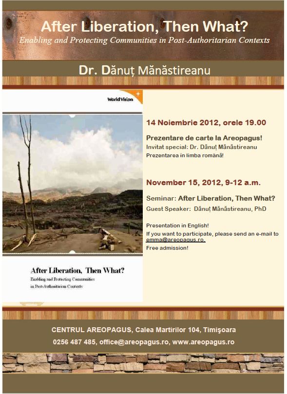 “God created all of us as free human beings, and sooner or later all authoritarian regimes (which do not acknowledge that freedom) will fall under the weight of their own economic ineffectiveness and inhumanity. When this happens, will people and communities be able to make the most of opportunities afforded by newly gained freedom?” (D. Manastireanu) (Prefata cartii poate fi citita integral aici).