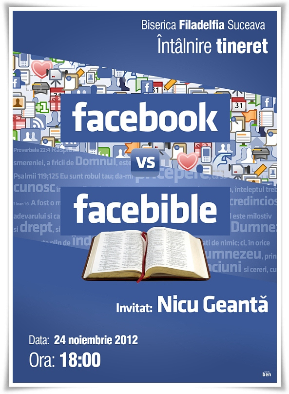 Share Facebook Twitter LinkedIn Pinterest Email Întâlnire de tineret la Biserica “Filadelfia” din Suceava cu tema “Facebook vs. Facebible”, în data de 24 noiembrie 2012, ora 18:00. Invitat: Nicu Geantă Apreciază:Apreciază Încarc... slider