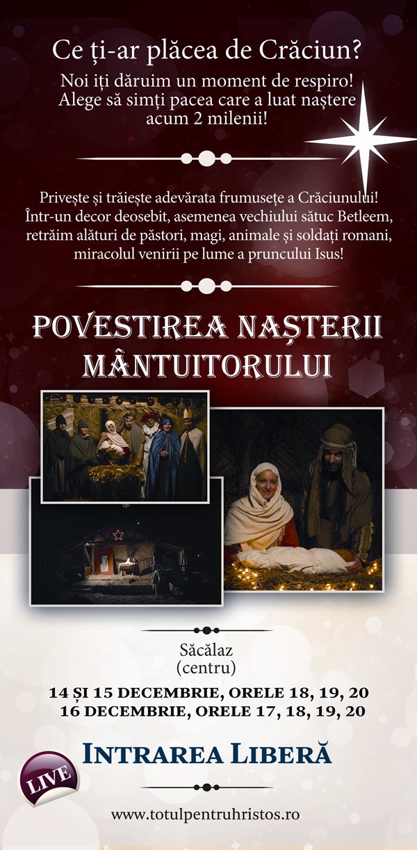 În perioada 14-16 decembrie 2012, Asociația Totul pentru Hristos vă prezintă un eveniment prin care se doreşte reamintirea atmosferei de Crăciun de acum 2000 de ani şi răspândirea adevăratului mesaj despre Naşterea Mântuitorului. Anul acesta are loc a cincea ediţie a evenimentului. Puteţi vedea un scurt istoric al ediţiilor anterioare aici sau mărturii ale câtorva persoane care au participat la aceste ediţii, aici.