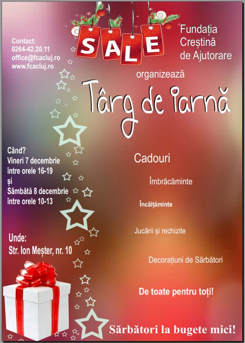 Fundatia Crestina de Ajutorare te invita la un “Targ de Iarna” in data de 7 decembrie 2012, intre orele 16 si 19, si in data de 8 decembrie 2012, intre orele 10 si 13. Vei gasi o gama bogata de articole de imbracaminte, incaltaminte si articole casnice, numai bune pentru familia si casa ta. Fondurile obtinute astfel sunt folosite pentru sustinerea proiectelor derulate de catre Fundatia Crestina de Ajutorare in comunitatea clujeana: distributie de materiale de incontinenta si medicamente, proiecte educationale si de mentorat: Mari si Mici, Mari Amici.