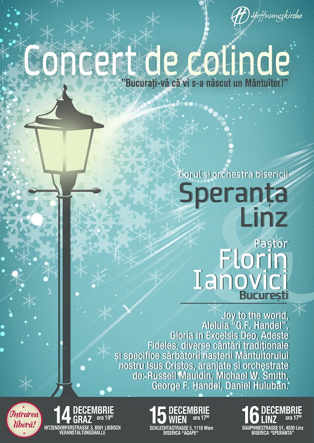 Apropiindu-ne de frumoasa sărbătoare a nașterii Mântuitorului nostru Isus Christos, Duhul Sfânt ne-a pus în inimă dorința de a duce Vestea Bună în câteva orașe din Austria. Prin colindele susținute de corul și orchestra Bisericii “Speranta” – Linz și mesajul Evangheliei propovăduit de fratele Florin Ianovici, ne rugăm ca Dumnezeu să atingă inimile noastre și ale celor nemântuiți, să transforme vieți și să aducă pace și bucurie în casele noastre.