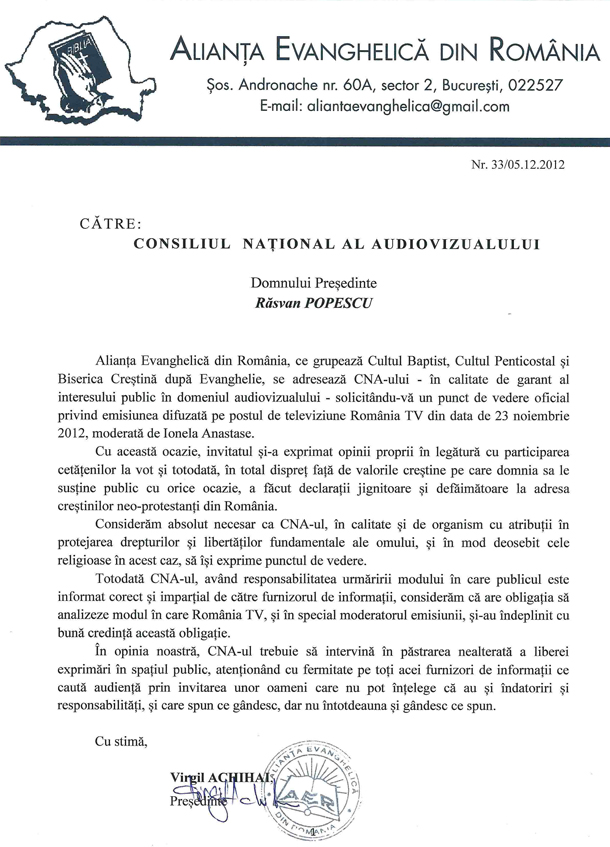 Puteți citi mai jos sesizarea înaintată de Alianța Evanghelică din Romania către Consiliul National al Audiovizualului, în legătură cu declarațiile făcute de către Gigi Becali pe postul România TV.