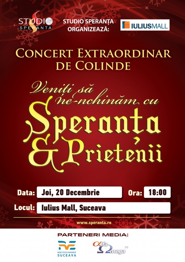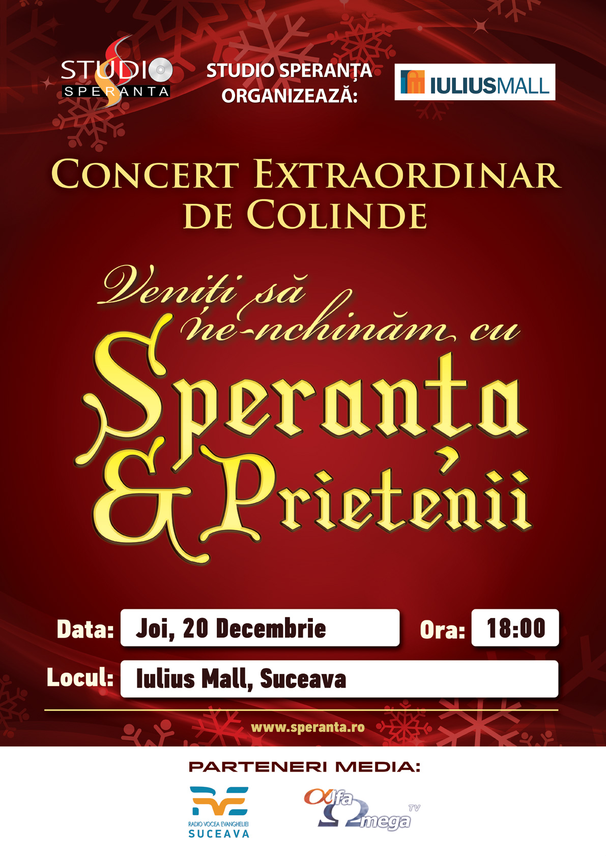 Share Facebook Twitter LinkedIn Pinterest Email Joi, 20 decembrie 2012, grupul Speranţa va susţine un concert de colinde la Iulius Mall, Suceava. Concertul va începe de la ora 18:00. Vă aşteptăm cu drag ! Apreciază:Apreciază Încarc... slider