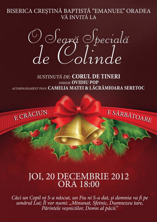 Biserica Creștină Baptistă “Emanuel” din Oradea vă invită joi, 20 decembrie 2012, ora 18.00, la o seară de închinare prin colinde, susținută de corul de tineri al bisericii. Programul va fi alcătuit din lucrări extrase din Concertul de Crăciun Sing Gloria – David Hamilton şi Let Haven and nature Sing – David Clydesdale, precum și colinde tradiționale.