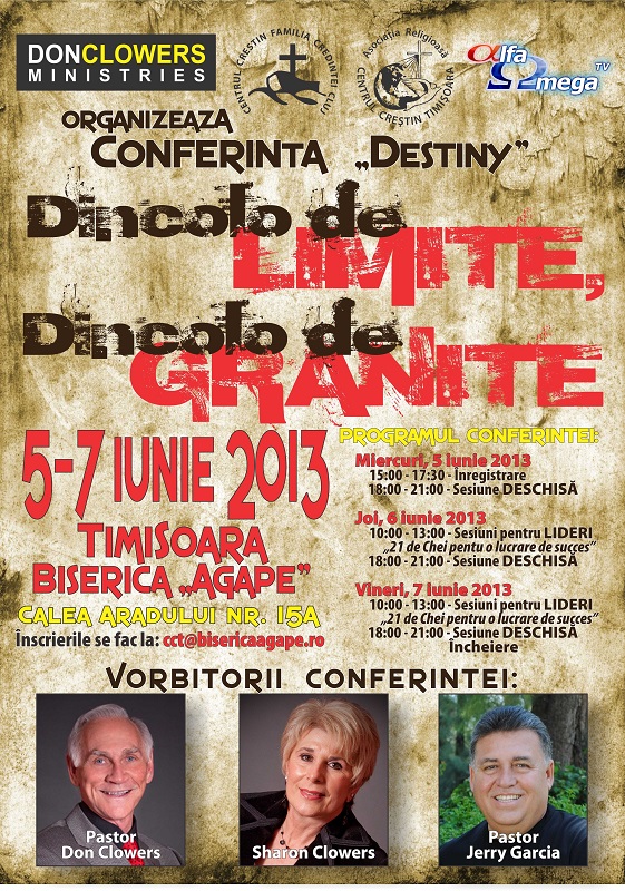 Cu deosebită bucurie vă invităm la Conferinţa “DESTINY” cu tema Dincolo de Limite, Dincolo de Graniţe, ce se va ţine la Timişoara, în complexul A.R. Centrul Creştin Timişoara, în perioada 5 – 7 iunie 2013.