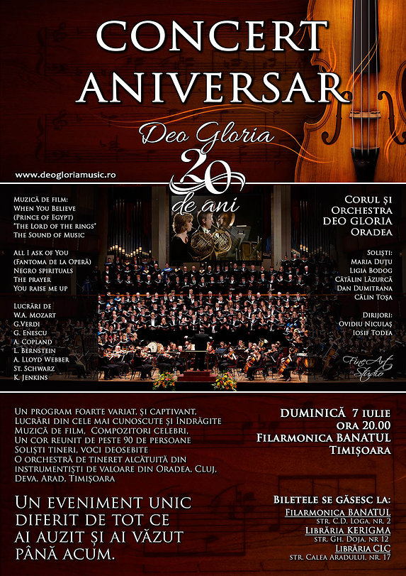 Un repertoriu de excepție, muzică de film, compozitori celebri, un cor reunit format din cei care au cântat în acești 20 de ani în cor, o orchestră alcătuită din instrumentiști de valoare. O dată la 20 de ani, într-un concert extraordinar corul și orchestra DEO GLORIA.
