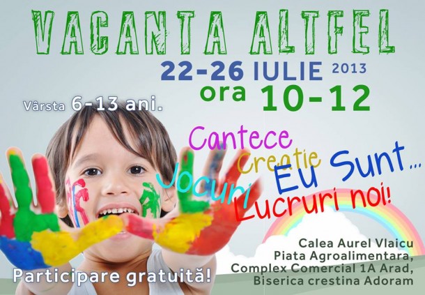 Saptamana 22-26 iulie, Biserica Crestina “Adoram” (Arad) va desfasura diverse activitati pentru copii sub titlul ‘’Vacanta altfel’’.