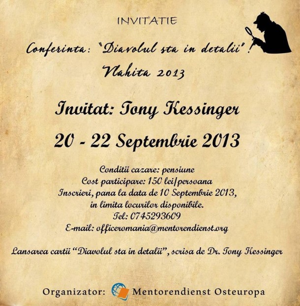 Share Facebook Twitter LinkedIn Pinterest Email Mentorendiest Osteuropa organizează la Vlăhița, în perioada 20-22 septembrie 2013, conferința cu titlu “Diavolul stă în detalii”. Invitatul principal va fi Tony Kessinger. Apreciază:Apreciază Încarc...