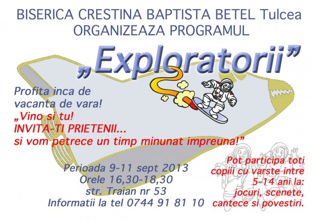 Biserica Creştină Baptistă “Betel” Tulcea organizează programul pentru copii “Exploratorii”, care se va desfăşura în perioada 9-11 septembrie 2013.