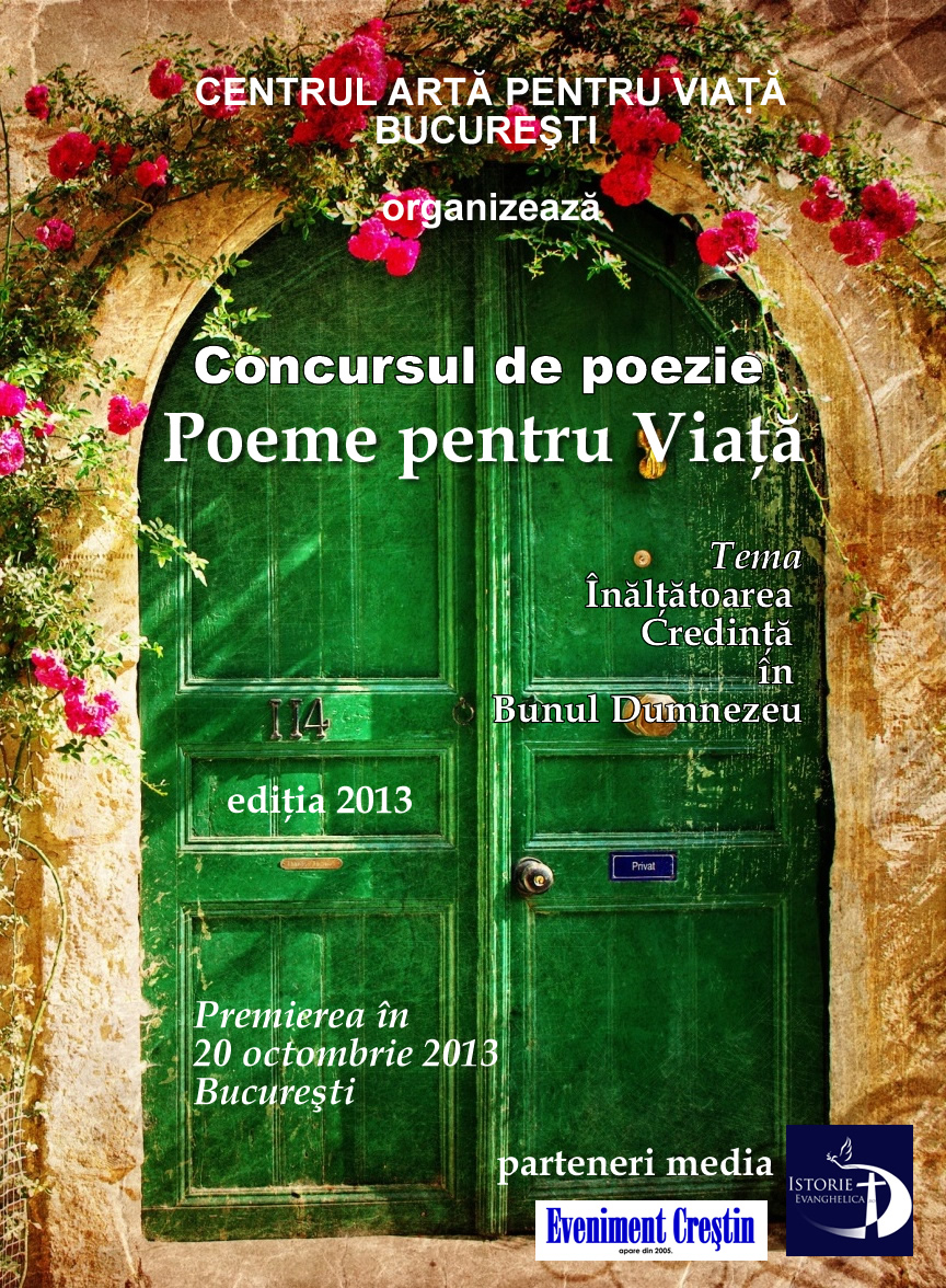 Concursul de poezie POEME PENTRU VIAŢĂ se desfăşoară în perioada 10 septembrie – 14 octombrie 2013. În concurs se pot înscrie gratuit persoane din ţară şi străinătate, artişti consacraţi şi debutanţi, cu vârsta minimî de 14 ani. Poeziile, trei la număr, se trimit la adresa birouapv@yahoo.com.