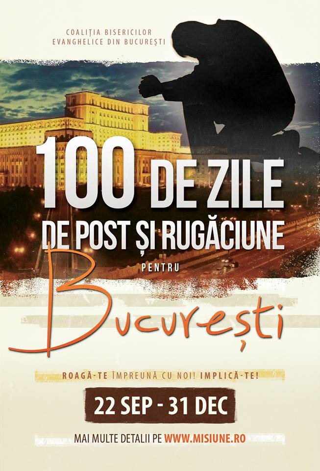 Grupul de Lideri si Slujtori din biserici evanghelice din București (GSLB) a convenit ca, începând cu 22 septembrie, să inițieze o acțiune de 100 de zile de post și rugăciune pentru orașul București.