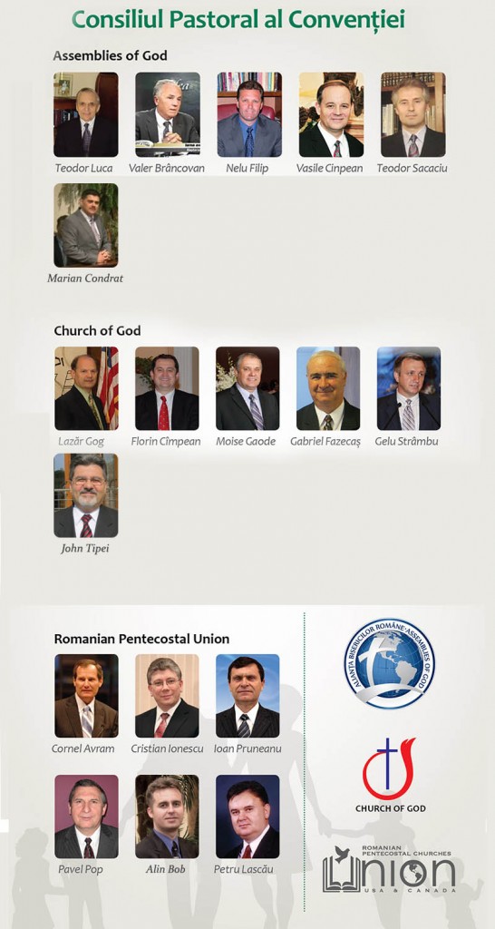 2012 – “Se constituie din liderul fiecărei organizaţii penticostale române (Assemblies of God, Church of God, Uniunea Penticostală Română), la care se adaugă câte patru păstori reprezentanţi ai acestor organizaţii, numiţi de liderii lor. De asemenea, liderii organizaţiilor sus-menţionate, de comun acord, vor invita un reprezentant din cadrul bisericilor române neafiliate. Pastorul Coordonator al Convenţiei va fi membru din oficiu al acestui Consiliu. Moderatorul Consiliului Pastoral va fi liderul organizaţiei din care face parte Pastorul Coordonator al Conveţiei.”(http://dorinpele.wordpress.com/2013/01/02/o-noua-structura-de-conducere-peste-bisericile-penticostale-romane-din-america/)
