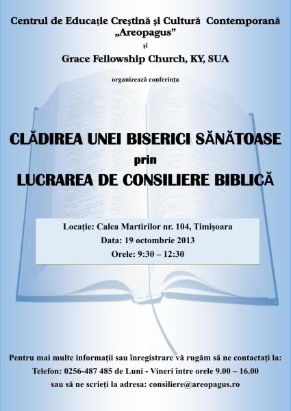 Conferinţa se va susţine pe 19 octombrie 2013 la sediul Centrului Areopagus, Calea Martirilor nr. 104, Timişoara şi se adresează îndeosebi persoanelor interesate de slujirea în biserică prin consiliere biblică. Scopul principal al conferinţei este să ofere orientare generală studenţilor înscrişi şi tuturor celor care doresc să beneficieze de pregătirea în consiliere oferită în cadrul Programului nostru de formare în consiliere biblică.