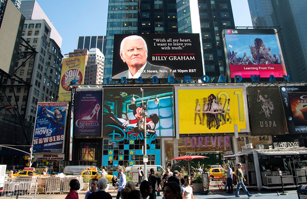 Deasupra intersecţiei comerciale Times Square, aşezat între anunţurile viu colorate care comercializează telefoane mobile, îmbrăcăminte şi prezentări Broadway, fizionomia lui Billy Graham apare pe un nou panou alături de un mesaj al evanghelistului în vârstă de nouăzeci şi patru de ani.
