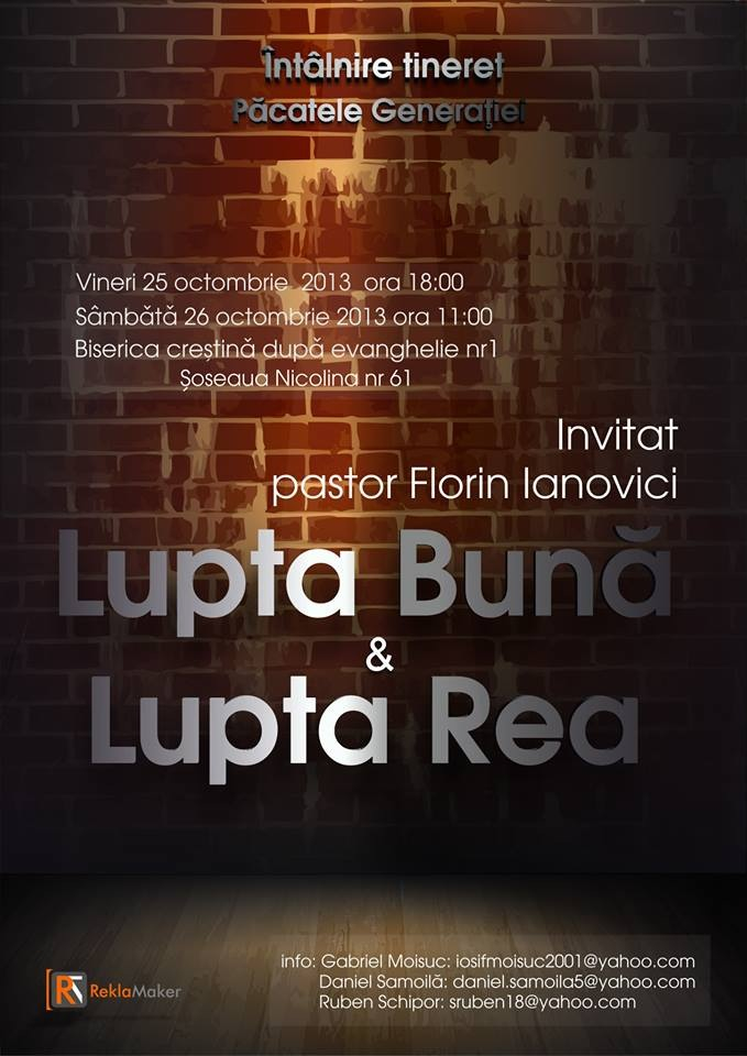 Biserica Creștină după Evanghelie nr 1, Nicolina (www.bisericanicolina.ro) invită toți tinerii din Iași să participe la o nouă conferintă din seria ”Păcatele generației”, cu tema ”Lupta bună și Lupta rea” , care va fi susținută de fratele păstor Florin Ianovici.