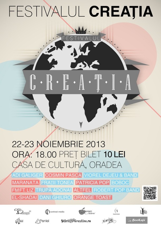 Festivalul Creația, care va avea loc în 22-23 noiembrie, începând cu orele 18 ,la Casa de Cultură din Oradea, își propune să aducă împreună artisti, trupe consacrate din Oradea care să aducă un suflu nou în închinarea lor prin muzica pe care I-o aduc românii lui Dumnezeu.