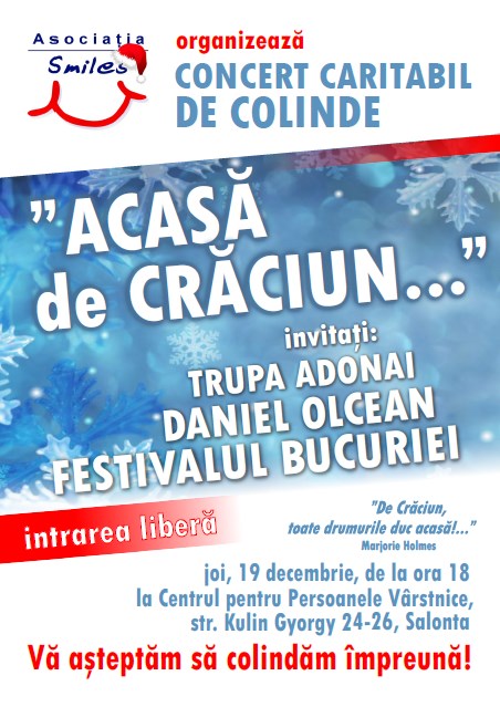 Share Facebook Twitter LinkedIn Pinterest Email Advertisement Your Ad Goes Here High-visibility banner placement Learn more Asociația SMILES organizează în data de Joi, 19 decembrie 2013, un concert caritabil. Locația: Centrul pentru Persoanele Vârstnice str. Kulin Gyorgy 24 – 26, SALONTA Invitați: Trupa Adonai Daniel Olcean Festivalul Bucuriei Intrarea LIBERĂ Apreciază:Apreciază Încarc... Advertisement Your Ad Goes Here High-visibility banner placement Learn more