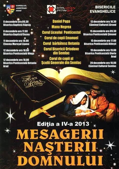 - Joi, 12 decembrie, orele 18.00 – Biserica Penticostală Betania din Arad