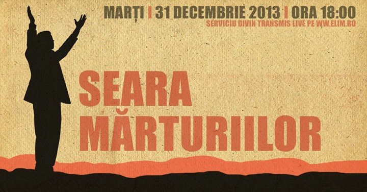 În ultima seară a anului 2013 începând cu ora 18 Biserica Penticostală Elim organizează un serviciu special de mărturii din partea celor care au experimentat intervenția lui Dumnezeu în viața lor pe parcursul acestui an.