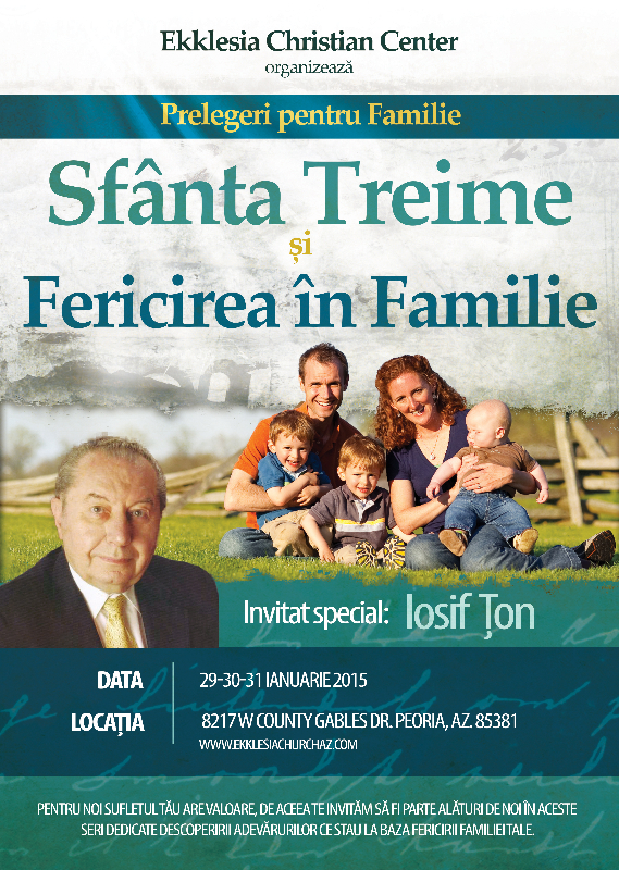 De aceea vă invităm să fiți parte la aceste sesiuni dedicate vieții de familie, în zilele de 29,30 și 31 ianuarie, 2015, la biserica română “Ekklesia Christian Center” situată la adresa: 8217 W Country Gables Drive, Peoria, Arizona, 85381.