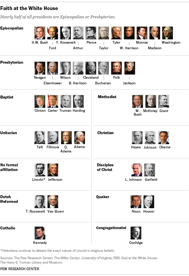 Constituţia Statelor Unite este celebră pentru interzicerea oricăror cerinţe sau teste religioase pentru funcţiile publice. Totuşi, majoritatea bărbaţilor care au fost preşedinţi au fost religioşi în mod deschis, cu multe apartenenţe la unele dintre cele mai proeminente denominaţiuni protestante ale ţării. Cu adevărat, aproximativ un sfert dintre preşedinţi – inclusiv unii dintre liderii faimoşi, ca George Washington, James Madison şi Franklin Roosevelt – au fost membri ai Bisericii Episcopale, succesoarea americană a Bisericii Anglicane.