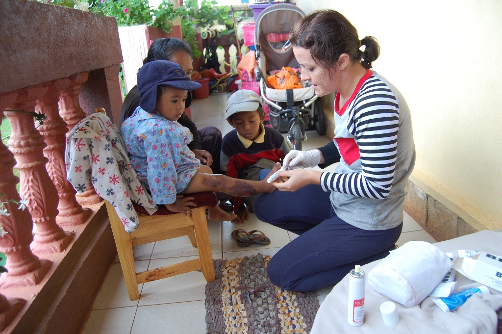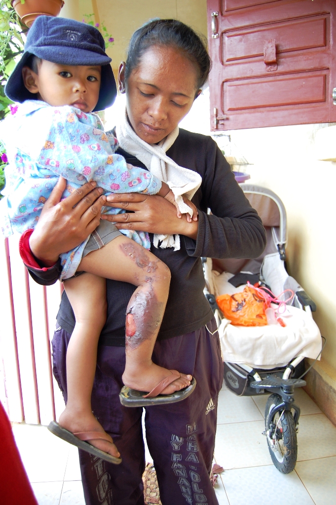 Acum 3 saptamani a venit la noi o mamica cu un baietel de 2 ani. Oamenii folosesc aici mici sobe artizanale pe care fierb apa sau fac de mancare si folosesc carbune pentru a intretine focul. Le tin de obicei afara, langa casa, ca sa nu dea foc casei, pentru ca focul este deschis. Pe o astfel de soba, aceasta mama a pus la fiert o oala cu apa. Copilul a tras vasul mare cu apa fiarta pe el. Si-a oparit piciorul drept foarte tare. Nu s-au dus la medic din pacate, dar au aplicat medicamentatie traditionala din unsori si uleiuri mai multe zile. Cred ca avea arsuri de gradul I, spre gradul II. Cand a venit la noi, era destul de infectat la picior. Ioana l-a tratat cu solutii speciale pentru arsuri si medicamente pentru infectii, dar apoi i-a cerut mamei sa il duca la medic. Acum copilul este mai bine, o parte din carnea si pielea de pe picior este bine vindecata, iar pentru partea de jos a piciorului inca are nevoie de tratament. Va chemam sa va rugati si pentru aceasta lucrare, care, chiar daca este mica, ia timp, e benefica si ii binecuvanteaza pe cei care beneficiaza de ea. De asemenea, va rugam sa va rugati pentru medicii care ne dau sfaturi, ne trimit medicamente constant, ca sa ajunga ei insisi in aceasta zona.