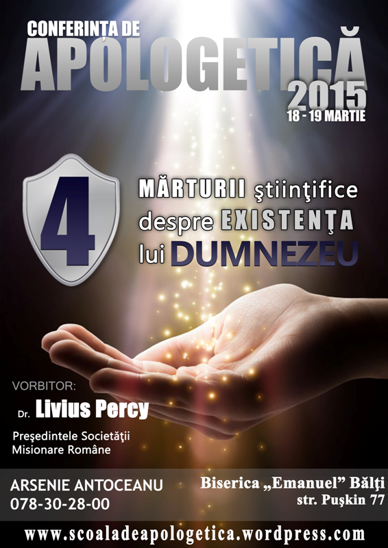 Miercuri şi joi, 18-19 martie 2015 vă aşteptăm între orele 17:00-20:00 la Biserica “Emanuel” din Bălţi la Conferinţa de Apologetică cu tema: “4 mărturii ştiinţifice despre existenţa lui Dumnezeu”!