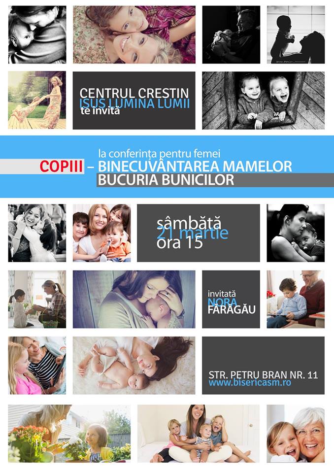 Share Facebook Twitter LinkedIn Pinterest Email Pe data de 21.03.2015 de la ora 15:00 Centru Creștin Isus Lumina Lumii din Satu Mare organizează o conferință de femei cu tema “Cresterea copiilor”. Vorbitoare va fi Nora Fărăgău din Cluj Napoca. Apreciază:Apreciază Încarc...