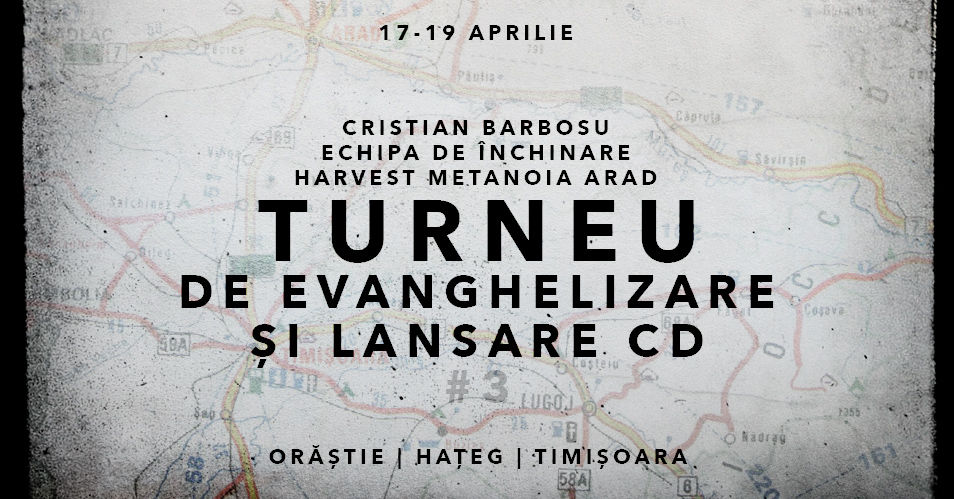 Cristian Barbosu împreună cu echipa de închinare a bisericii Harvest Metanoia se vor afla într-un nou turneu de evanghelizare în perioada 17-19 aprilie. Cu această ocazie vor fi lansate şi în aceste locuri CD-urile „Adorare” I & II, cu melodii din repertoriul de închinare al bisericii Harvest Metanoia. Vă invităm să participaţi şi voi împreună cu noi: