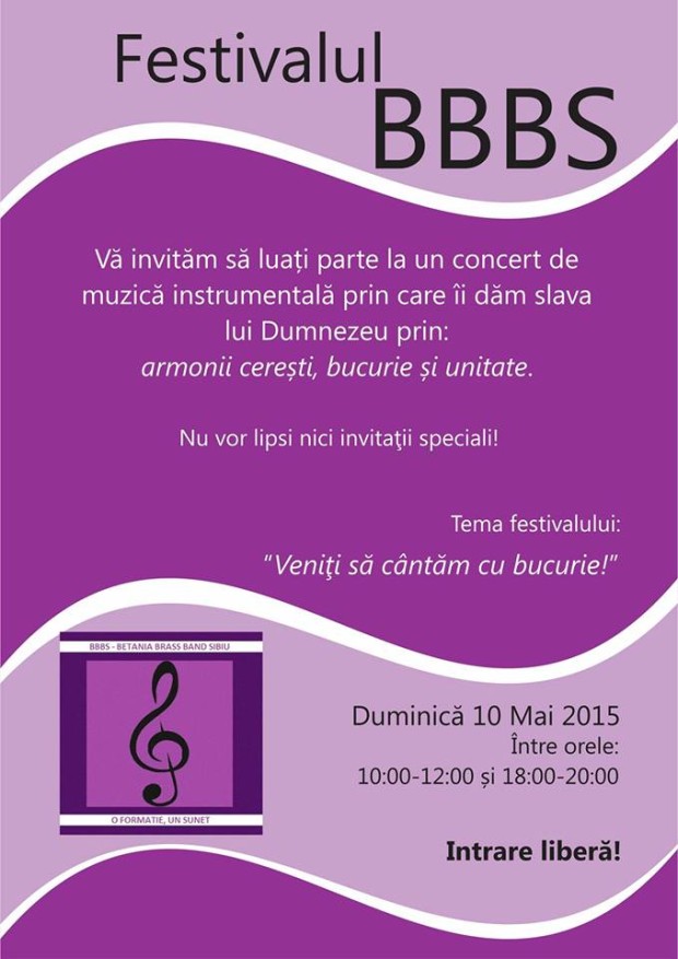 * 10 Mai 2015 – 2 concerte : ora 10:00 si ora 18:00- Adresa: str. Pielarilor nr 6-8 , Biserica Baptista Betania, Sibiu.