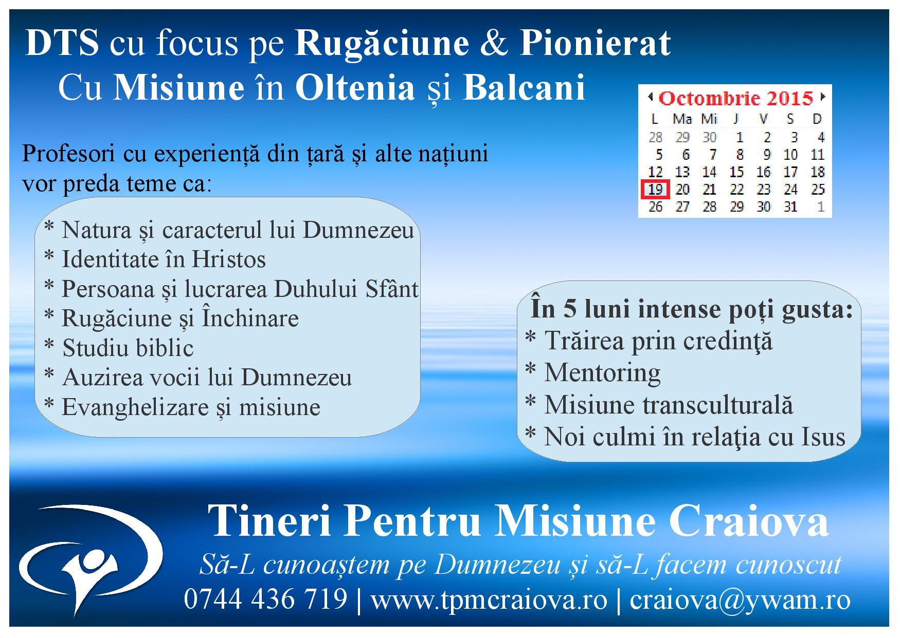 – Școala internațională de ucenicie și misiune la Craiova (DTS): 19 oct 2015 – 18 mar 2016.