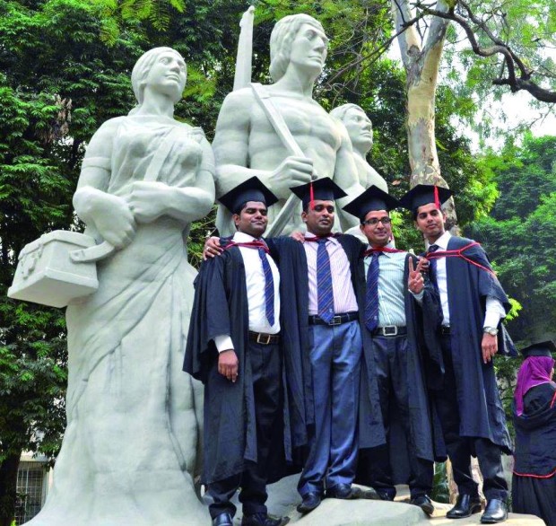Unui profesor în vârstă îi face plăcere să îşi conducă vizitatorii până la treptele din faţa clădirii, unde se află un mare monument ilustrând doi bărbaţi şi o femeie în poziţie eroică, amintind vizitatorului faptul că Universitatea din Dhaka a fost un contribuabil semnificativ la istoria modernă a Bangladeshului. În urma divizării Indiei, a devenit centrul mişcărilor progresive şi democratice. “Vom continua această tradiţie”, asigură profesorul.