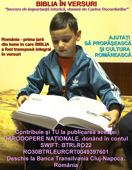 Este o idee MINUNATA,in special pentru faptul ca prin rime Sfanta Scriptura va putea fi memorata mult mai usor de oricine doreste sa o invete pe dinauntru si pe dinafara.Sfarsitul este APROAPE. Dar chiar daca ni se va lua totul,daca-L vom purta pe Domnul prin Cuvantul Sau in inimile si in mintea noastra vom fi cei mai bogati in veci.