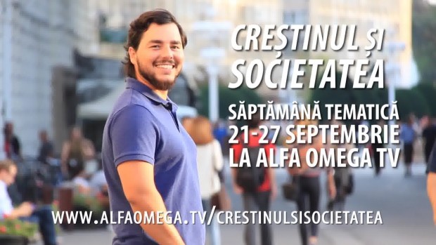 În perioada 21-27 septembrie 2015, Alfa Omega TV vă propune o săptămână tematică cu titlul Creștinul si societatea. Vă vom prezenta poveștile impresionante ale unor români care își trăiesc credința acolo unde i-a pus Dumnezeu în societate, care implică valorile și credința lor în deciziile de zi cu zi, care fac tot posibilul să-L reprezinte pe Hristos acolo unde sunt. Vom publica interviuri, reportaje, emisiuni, articole și alte materiale pe TV, website, facebook si email!