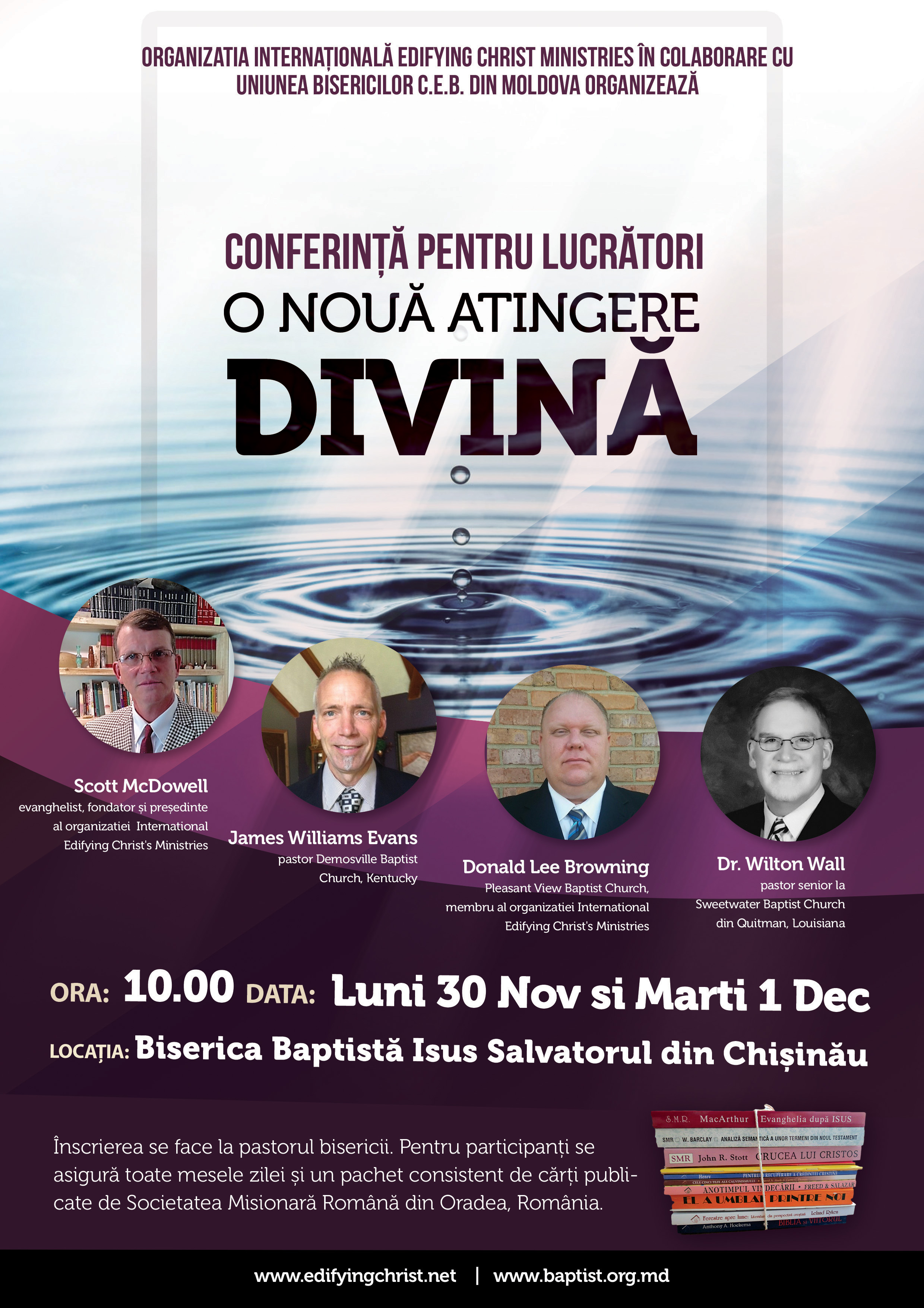 În perioada, 30 noiembrie-04 decembrie, toţi slujitorii din Comunitățile Chişinău și Cahul sunt invitaţi la Conferinţa Pastorală cu tema: “O nouă atingere Divină”. Evenimentul este organizat de Edifying Chirst’s Ministries în colaborare cu Uniunea Bisericilor Creştine Evanghelice Baptiste (UBCEB).