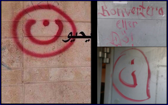 În luna octombrie, 2015, pe zidul unei brutării și al unei pizzerii din Gothenburg, Suedia a apărut un graffiti pe care scria: “Te convertești sau mori” și „Califatul este aici”. Logo-ul Statului Islamic și litera arabă „nun” (N de la nazarinean, adică creștin) au fost pictate, de asemenea, pe acei pereți.