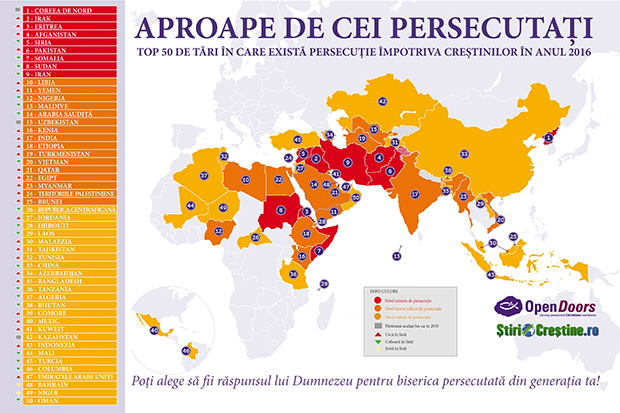 Lista cu cele 50 de țări în care există persecuții împotriva creștinilor în 2016 și programul de rugăciune pentru aceste țări poate fi descărcat în format de print. Vă recomandăm să descărcați, tipăriți, afisați și foloșiți acest program de rugăciune în biserica dvs., la programele sau grupele de rugăciune și de asemenea la timpul vostru personal de acasă.