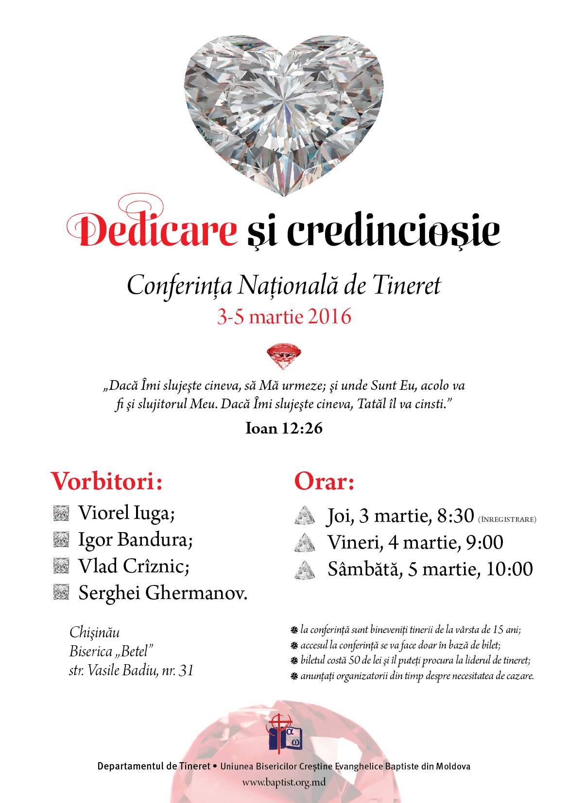 Primul eveniment de talie naţională de pe Agenda anului: “Dedicare şi Credincioşie lui Dumnezeu” este Conferinţa Naţională de Tineret. Toţi tinerii din Uniunea Bisericilor Creştine Evanghelice Baptiste sunt invitaţi în perioada, 03-05 martie la cea de-a III-a Conferinţă Naţională cu genericul: “Dedicare şi Credincioşie lui Dumnezeu”.