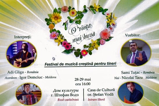 Adi Gliga şi Samuel Tuţac vor sluji timp de două zile la Festivalul “O viaţă mai bună” din judeţul Ştefan Vodă, Republica Moldova. Evenimentul va fi găzduit de Casa de Cultură din localitate în perioada 28-29 mai şi are scop evanghelistic.