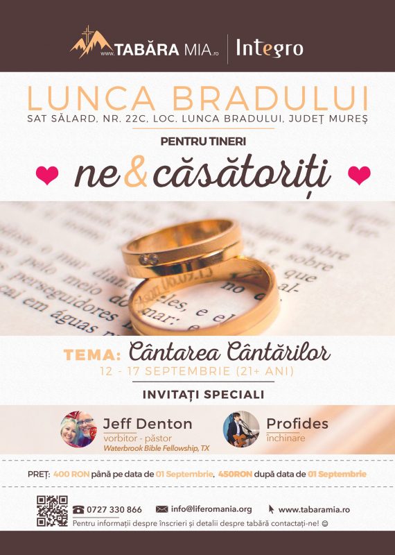 Tabara MIA va pune la dispozitie o saptamana de tabara pentru a va oferi invatatura biblica in acest sens, prin parcurgerea cartii “Cantarea Cantarilor” alaturi de profesorul și pastorul Jeff Denton, iar închinarea va fi condusa de catre formatia Profides.
